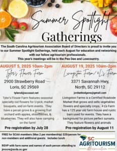 Join us for the LowCountry gathering where we will visit a Certified Roadside Market and view their productions fields, where they grow vegetables, flowers and specialty crops. We will then head over to 4 L’s farm for a wonderful Certified SC grown lunch. Guest speaker will be Klye Player from the ACRE program that will share how you can fund programs on your farm with free money! It will be a great day of networking and touring SC agritourism farms.